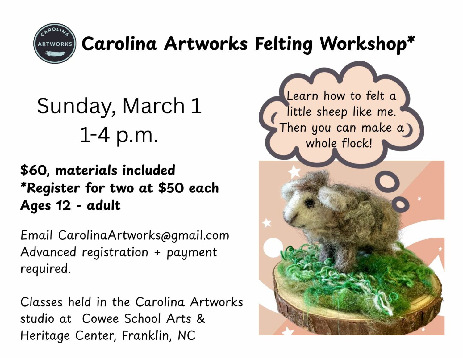 Learn both wet and needle felting while using wool and silk to make two necklaces. To register, call the Center for Learning Enrichment (CLE) at (828) 526-8811.