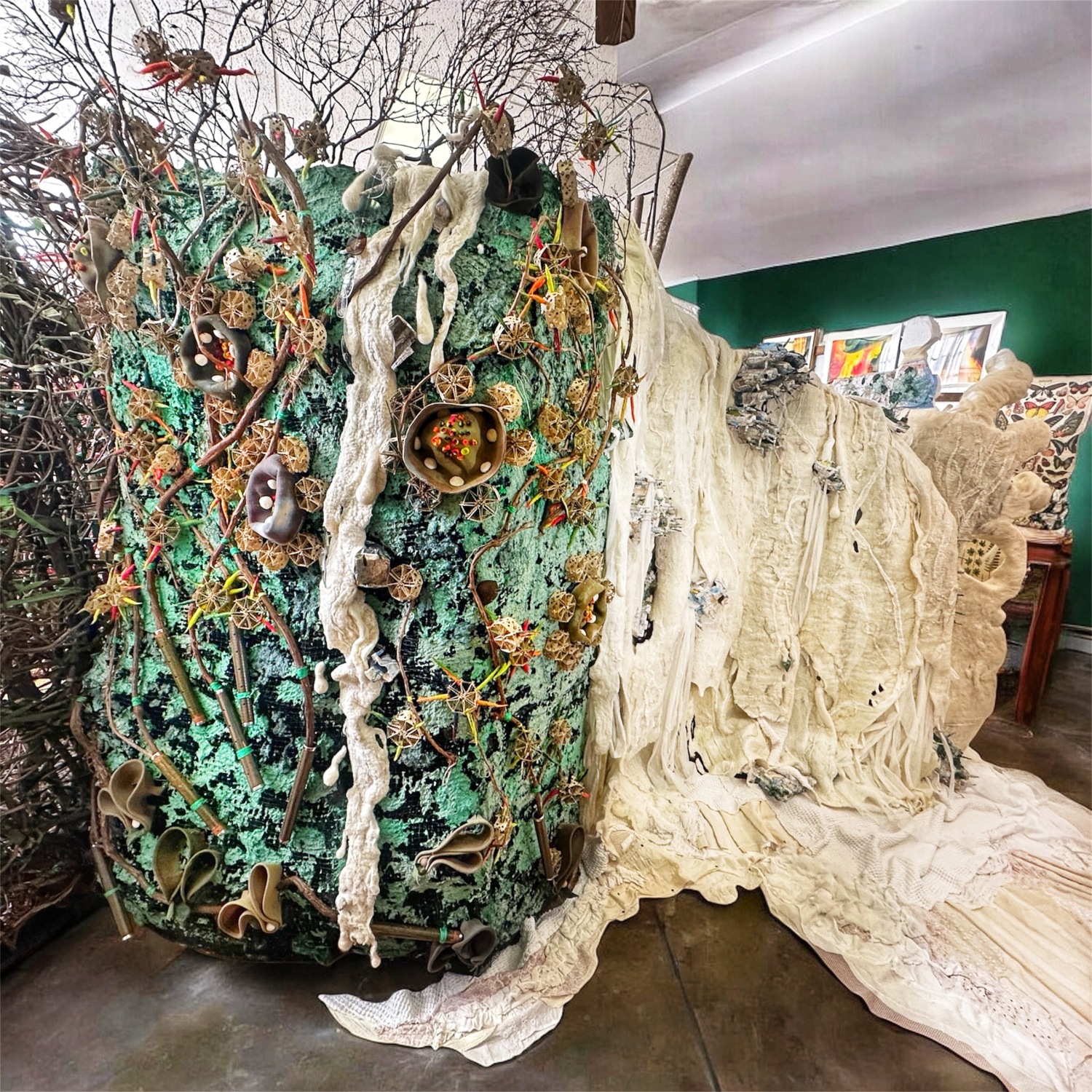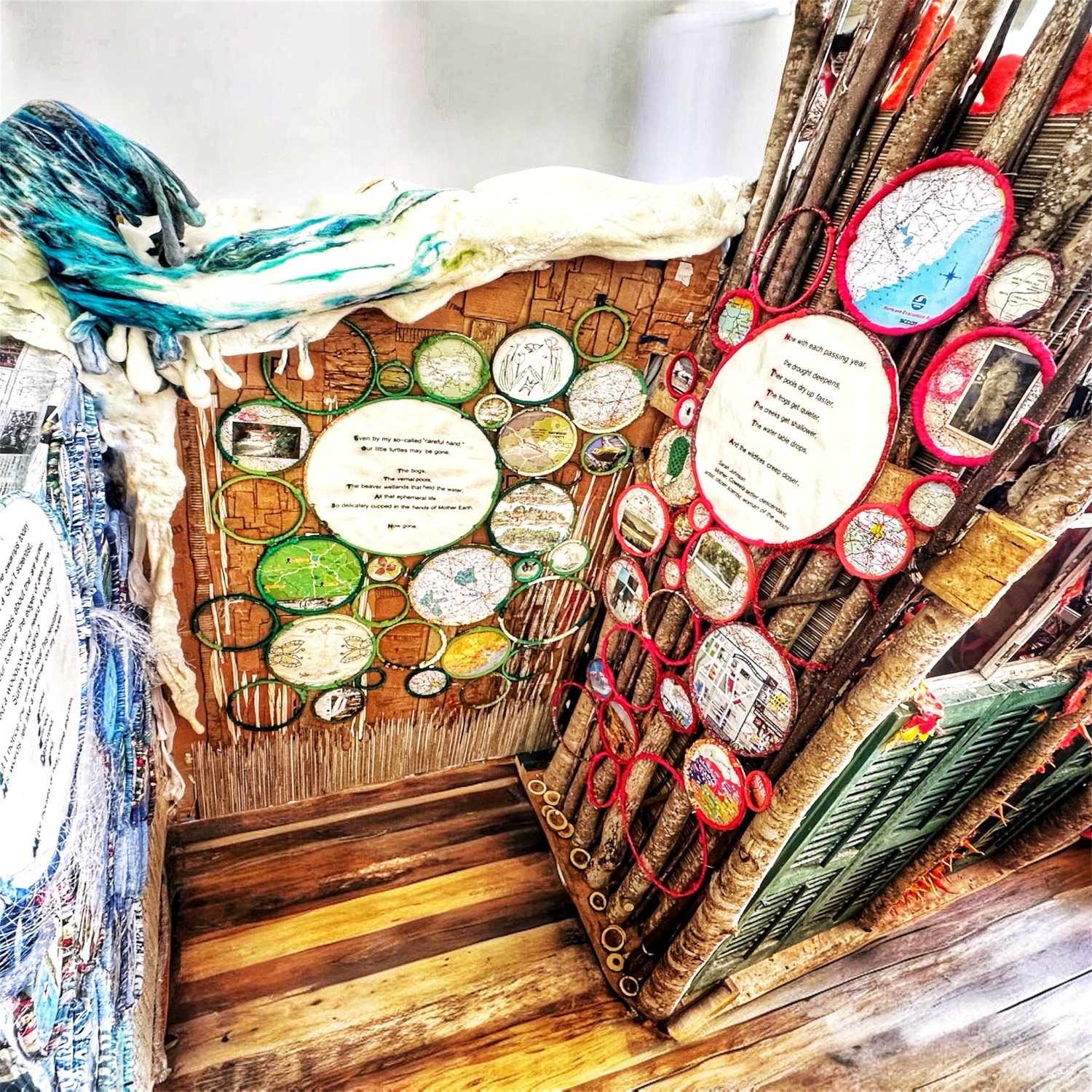 Visitors can begin by entering River Nest, a structure woven from foraged grape, willow, and kudzu vines. Inside they can peek into Seething Planet before exiting to wind around the verdant Dream State mountainside and fiber waterfall. The waterfall transitions into a textile stream, and then into Unwalled, which is a 7-foot tall felt-sculpted splash representing the previously unprecedented climate-driven floods. After Unwalled, visitors move to the Hard Lessons nook with textile information bubbles about the positive and negative conditions in our current natural world. They will conclude by fully facing Seething Planet, an examination of humanity's contributions to the crisis and the existing consequences, depicted using Louise Nevelson-style relic boxes leading to a blazing forest fire. Each phase of Cat. 6? has an accompanying sound experience, created by Shafer and Wilson, who commissioned for the project. (Scroll down for photos).