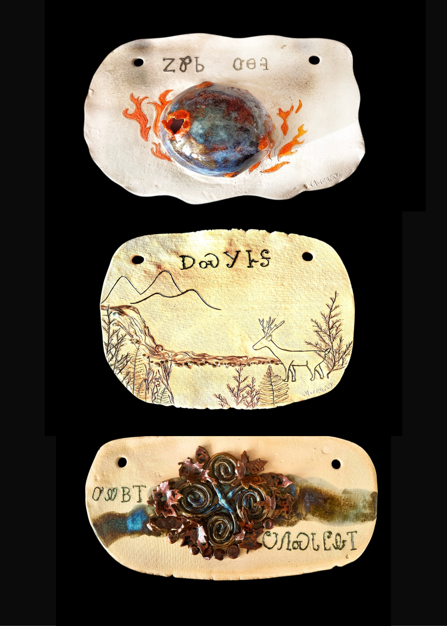 Pottery plaques that will be affixed to the Seething Planet, Dream State, and River Nest phases, created