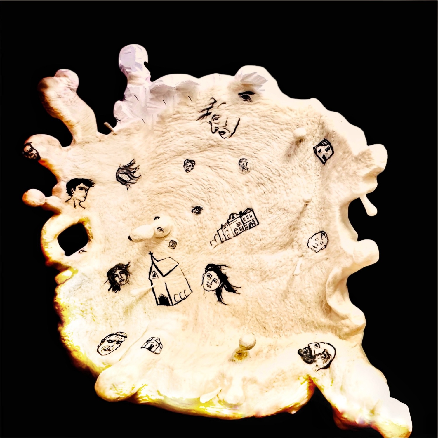 This is the Unwalled phase, not quite finished and taken under the restrictions of Keelor's studio (a head-on shot was not possible at this time). It is approximately 8' x 7'. The armature was sculpted with a hot wire after combining and shaping salvaged styrofoam. The styrofoam was then needle felted with merino wool roving and industrial waste wool. It indicates a large splash, flood or hurricane with sketches of people and buildings that were lost in climate-driven disasters.