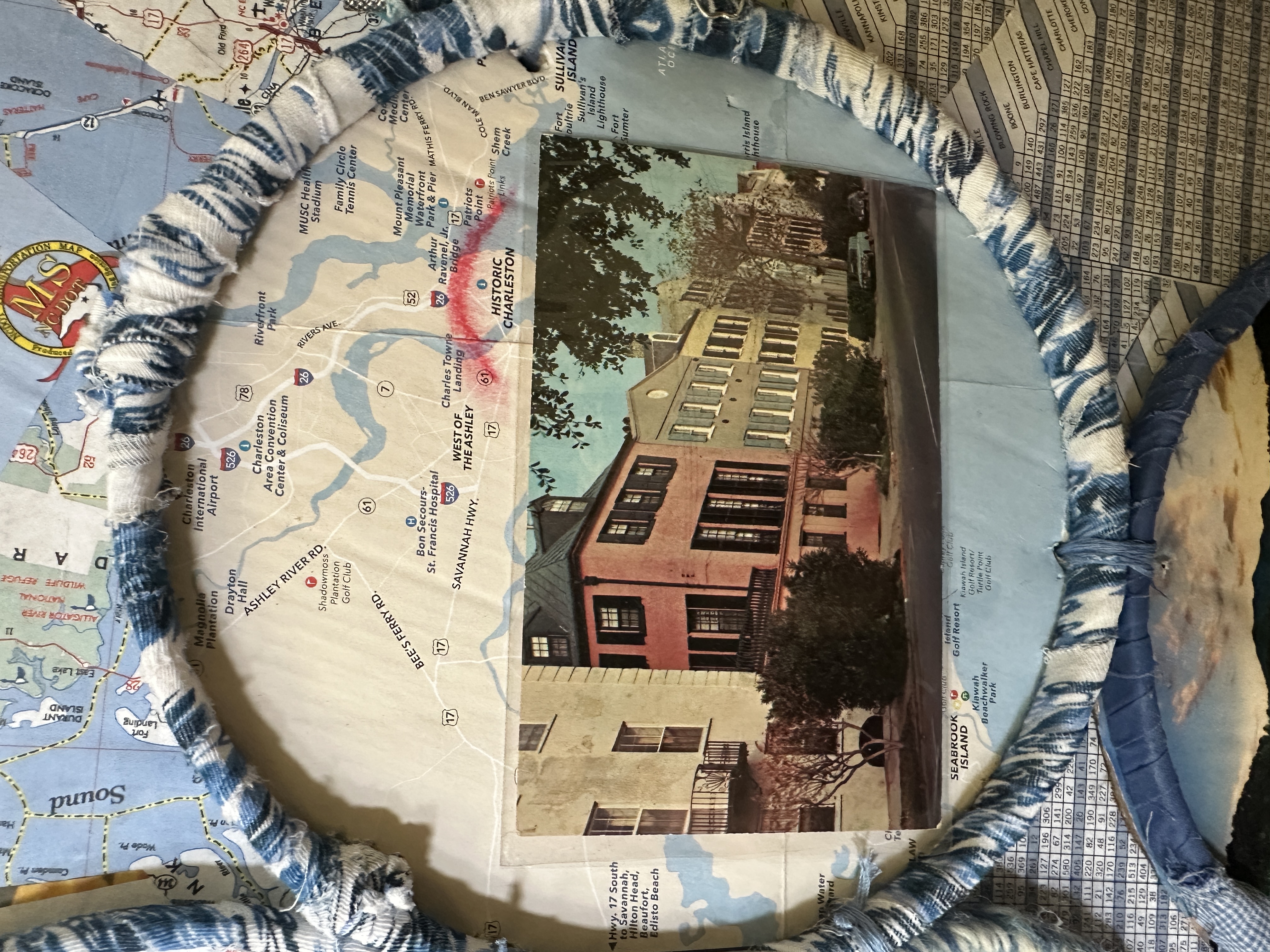 The processes and materials are listed, phase by phase, below on this page. Examples include felt making, textile deconstruction, hand building clay, hand stitching and lashing, machine sewing, collage, paper pulp making, sculpture and weaving. Approximately 85 percent of the materials were foraged, found, salvaged or donated. Examples include big box store plastic plant trays; industrial waste merino wool from a South Carolina textile mill; donated non-recyclable eyeglass blanks; expired NCDOT road maps; and post-consumer plastic.
