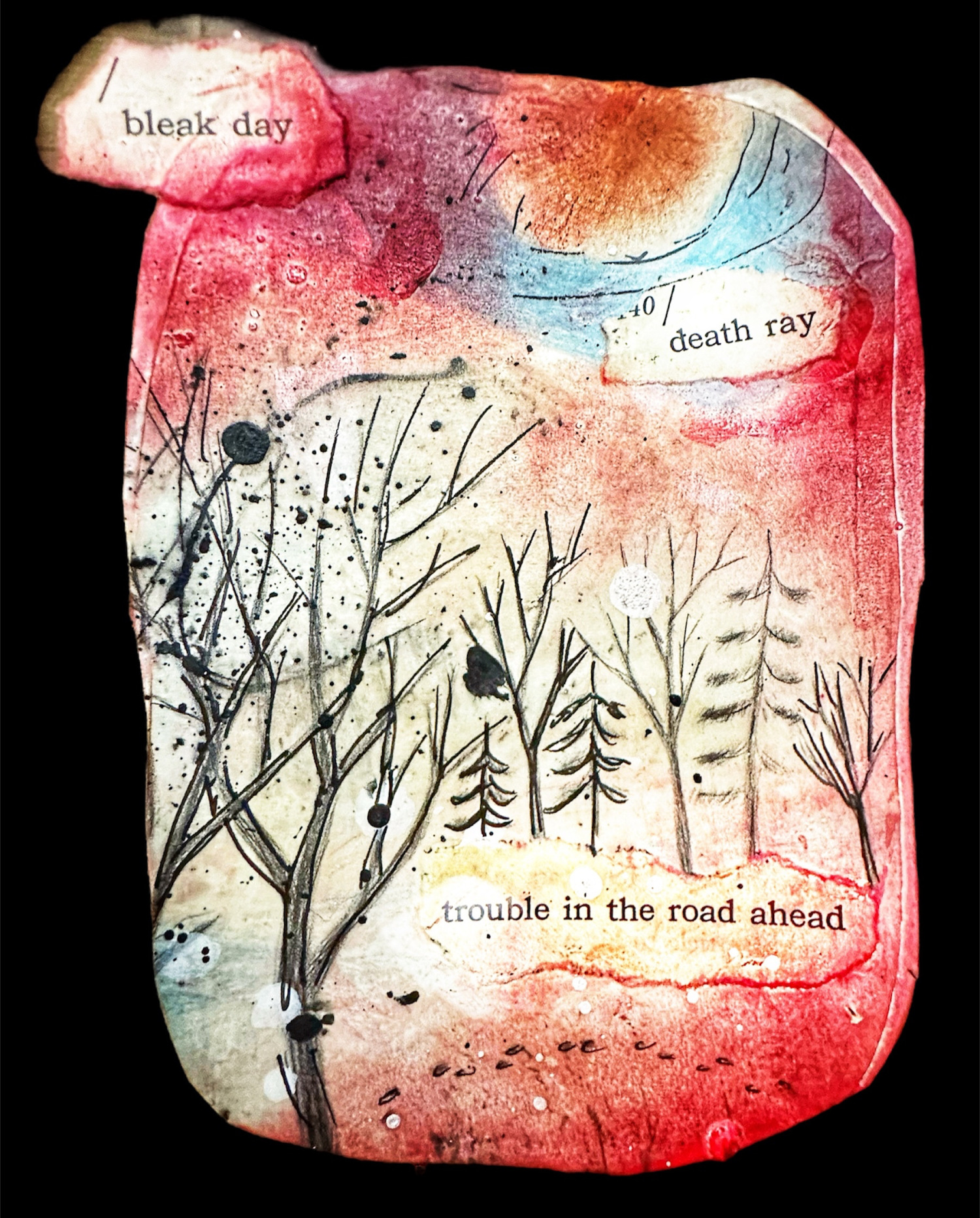 A micro-view of one of the collage panels comprising the causes and consequences sculpture that is within the Seething Planet phase.